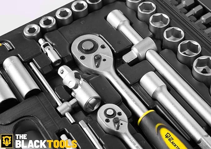 O Jogo de Soquetes e Chaves 94 Peças TKF94 da The Black Tools é a solução completa para profissionais e entusiastas que buscam versatilidade, robustez e praticidade. Produzidas em aço cromo-vanádio com acabamento cromado, as peças garantem resistência, durabilidade e alto desempenho em manutenções gerais. Acompanha maleta plástica com berços de identificação para fácil organização e transporte, tornando-o indispensável em oficinas mecânicas, construção civil e uso automotivo.