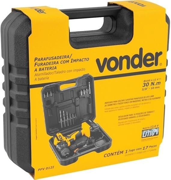 | Componentes incluídos | 1 Parafusadeira/furadeira. Acompanha: 1 maleta, 1 bateria de 12 V, 1 fonte bivolt automática, 6 brocas de aço rápido (1,5 mm, 2,5 mm, 3,0 mm, 4,0 mm, 5,0 mm e 6,0 mm), 6 bits (2 fendas (5 mm e 6 mm), 2 phillips (PH1 e PH2) e 2 pozidrive (PZ1 e PZ2)) e 1 soquete magnético encaixe de 1/4″ |
